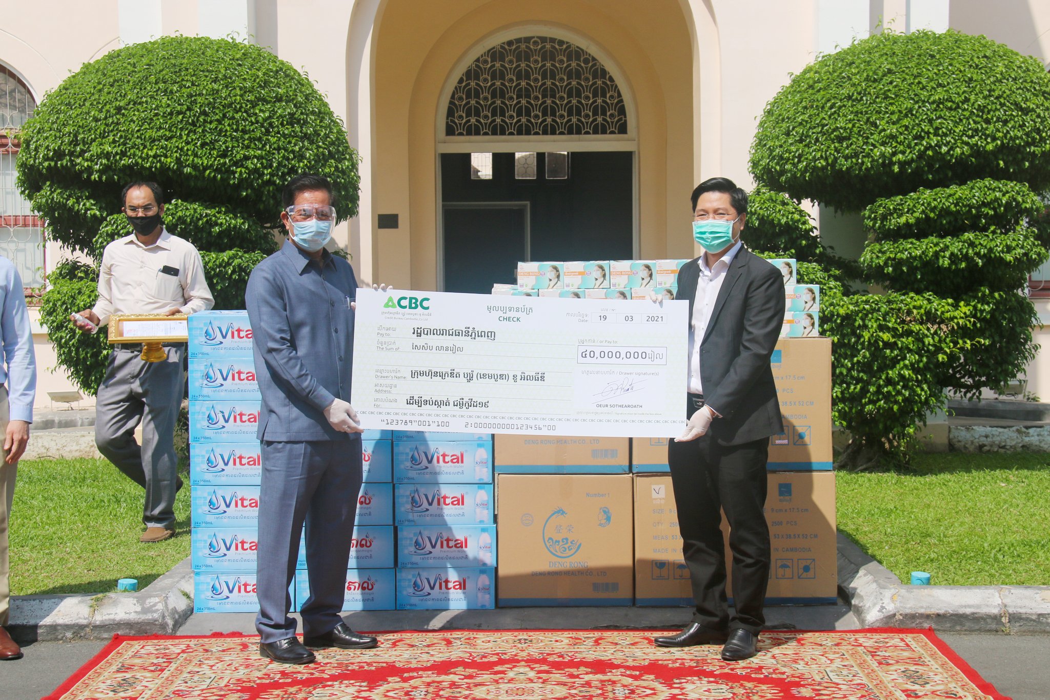 Phnom Penh on 19th March 2021, Credit Bureau (Cambodia) Co., Ltd. (CBC) made contributions to support initiatives of Phnom Penh Capital Hall in containing the spread of COVID-19. CBC handed over KHR 40 million financial contribution along with 50,000 pieces of protective masks and 12,000 water bottles in the presence of H.E. Khuong Sreng, Governor of Phnom Penh City.