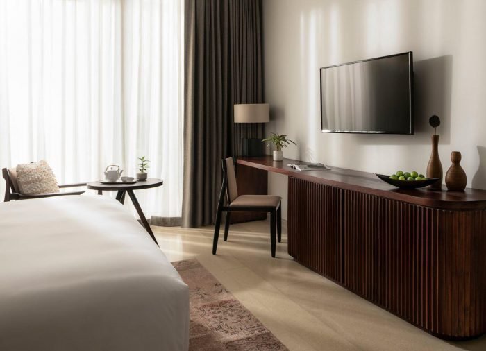 Art and design lie at the core of Treeline Urban Resort, beginning with the resort’s light-filled lobby that is furnished with natural materials. Here, guests can admire the sky-high installation by Pich Sopheap, one of Cambodia’s most acclaimed artists, and through its woven bamboo, the resort’s flowering open-air courtyard.